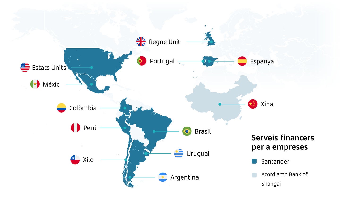Podràs accedir a l'oferta de valor de Santander Multinacionals des dels 12 països on treballem amb empreses: Argentina, Brasil, Colòmbia, Xile, Espanya, Estats Units, Mèxic, Perú, Portugal, Regne Unit, Uruguai i la Xina (a través del conveni amb Bank of Shanghai).