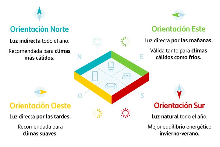 Sin embargo, si vives en el sur de España, en regiones cálidas y con muchas horas de sol al año, la mejor orientación será la norte. Al impactar el sol en la vivienda de forma indirecta, esta recibirá menos luz y calor, lo que ayudará a mantener la temperatura más fresca en el interior de la casa, especialmente en verano.