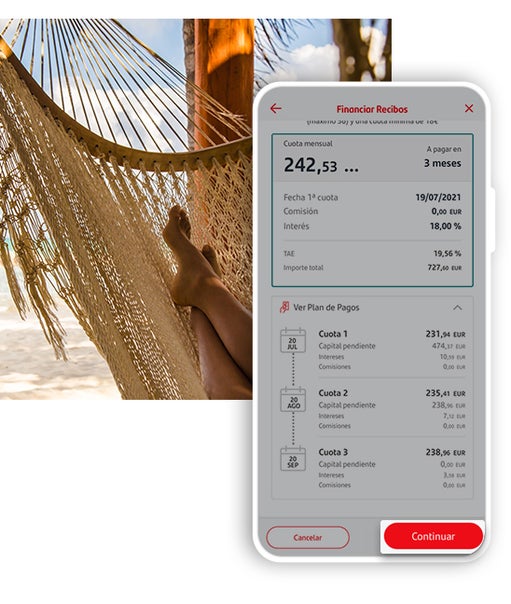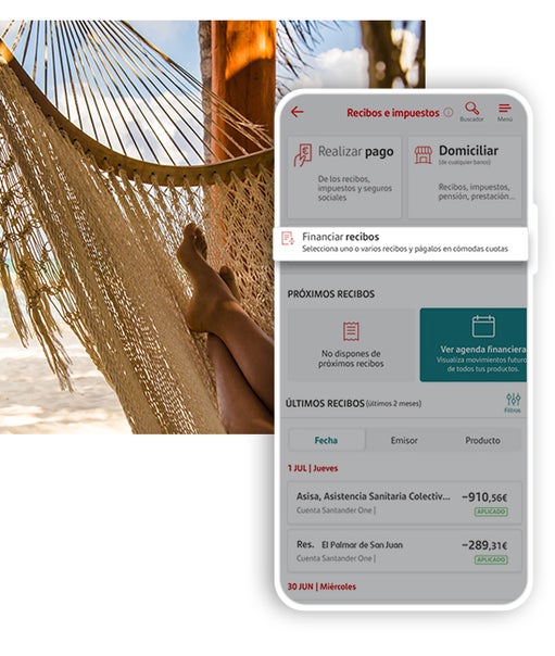 Des de l'aplicació Santander, localitza la secció de “Rebuts i impostos” i prem l'opció “Finançar rebuts”1.
