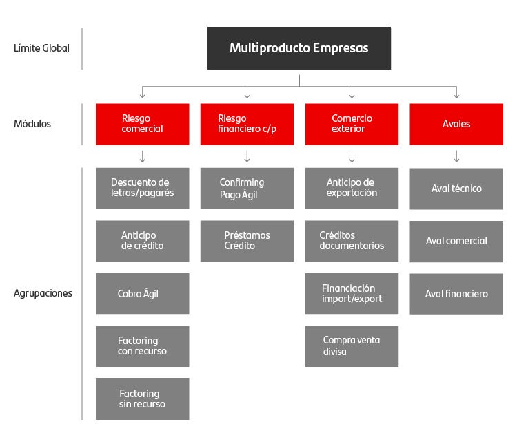 La póliza tiene una estructura con un límite global, bajo el que se agrupan los productos de financiación a corto plazo que se pueden gestionar de forma unificada:
