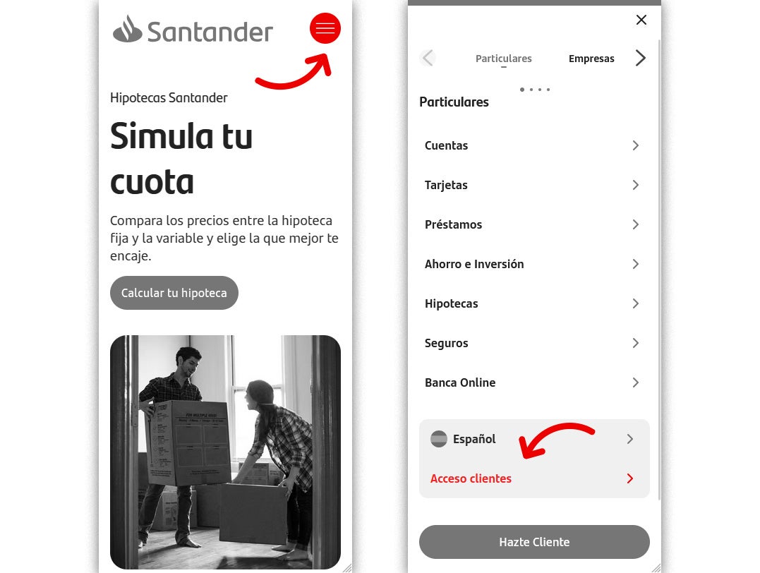 - Si estás usando tu móvil o tablet para consultar el saldo de tu cuenta desde la web del Banco, deberás pinchar en el menú de la derecha. Al hacerlo, se desplegará un menú donde podrás encontrar el botón de “Acceso clientes”: