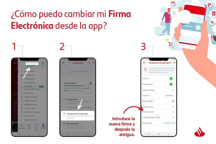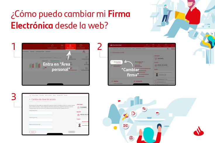 La Firma Electrónica te permite autorizar operaciones en los distintos canales (banca móvil, banca online y Superlínea). Si deseas modificarla, puedes hacerlo utilizando la App Santander o desde la Banca Online.