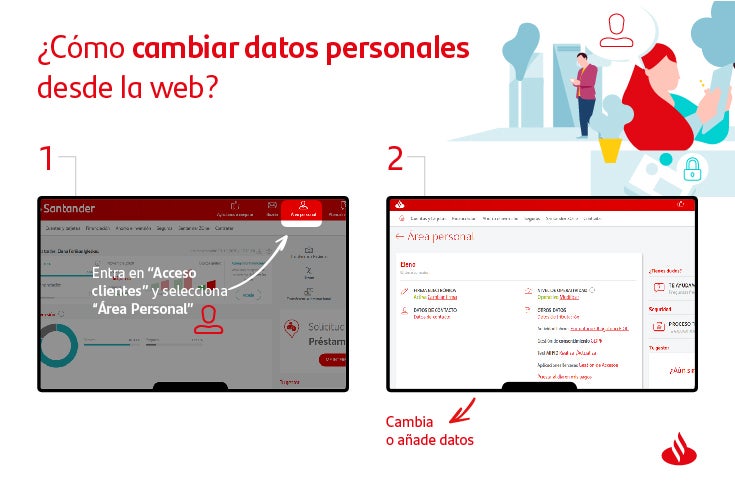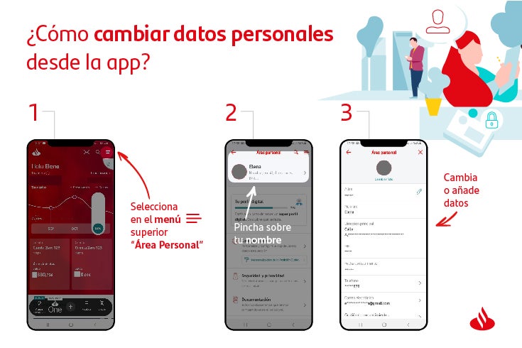 También puedes hacer estas modificaciones accediendo a la Banca Online de Santander con tus credenciales. En la parte superior de la pantalla selecciona “Área personal”, entra después en la opción “Datos de contacto” y realiza los cambios oportunos. Deberás completar la operación con tu firma electrónica.